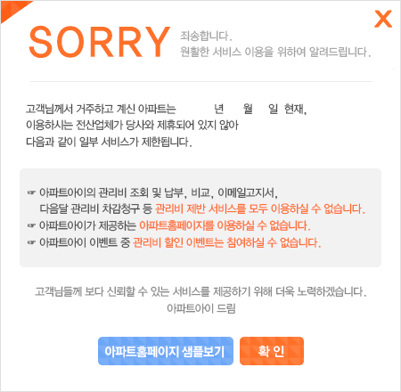 ȸ¿ø´ÔÀÇ ´ÜÁö °ü¸®»ç¹«¼Ò¿¡¼­ ¾ÆÆÄÆ®¾ÆÀÌ ¹«·áÁ¦°ø ȨÆäÀÌÁö¸¦ ¿î¿µÇÏÁö ¾ÊÀ» °æ¿ì, ÀÌ¿ë ½Ã ¾î·Á¿òÀÌ Àְųª ÀÌ¿ë ÀÚü°¡ ºÒ°¡ÇÒ ¼öµµ ÀÖ½À´Ï´Ù.
